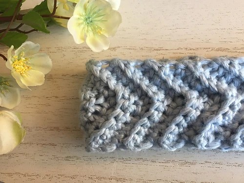 Joy is crocheting a ribbed chevron headband.