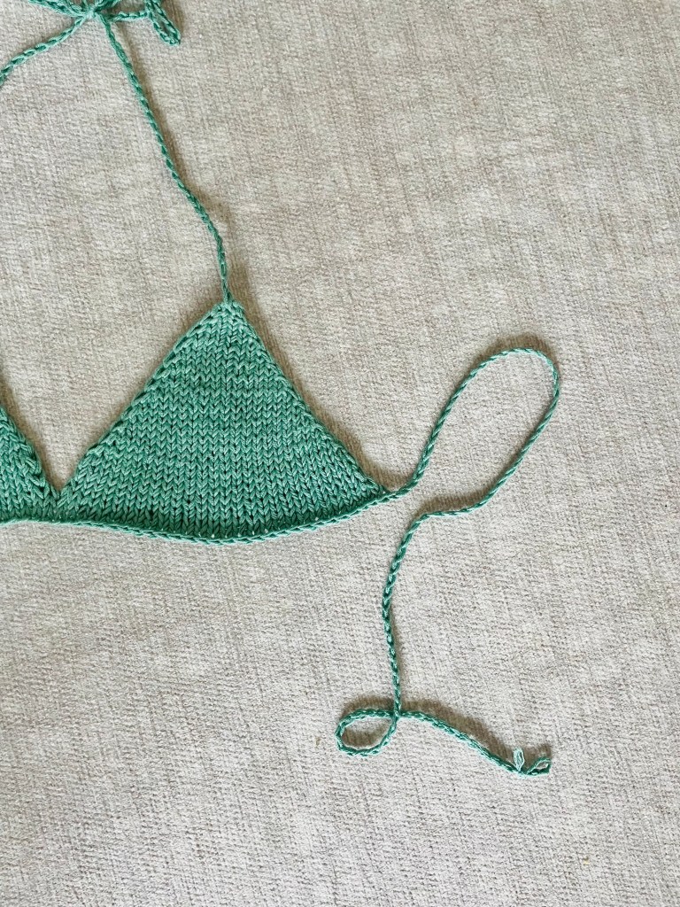 If you’re afraid a triangle bikini won’t fit you right, don’t fear. I used to hate triangle bikinis because they always gapped in the wrong places. However, when I decided to finally make my own, I realized that knitting a bikini means that I could stop whenever the measurements fit ME. This makes the experience so much more customizable and personalized, so I highly recommend you give the triangle bikini a second chance!