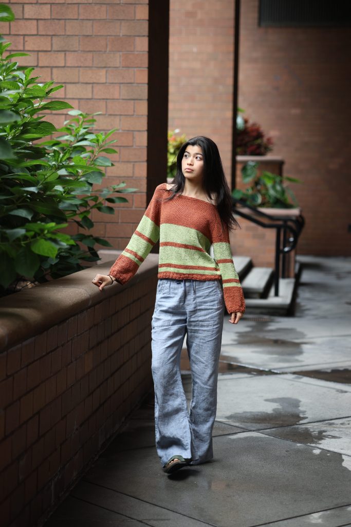 I also love how this sweater invites you to experiment with colors and striping effects. I made mine in a brick red color with neon green stripes and I truly love the resulting unique color combination.
