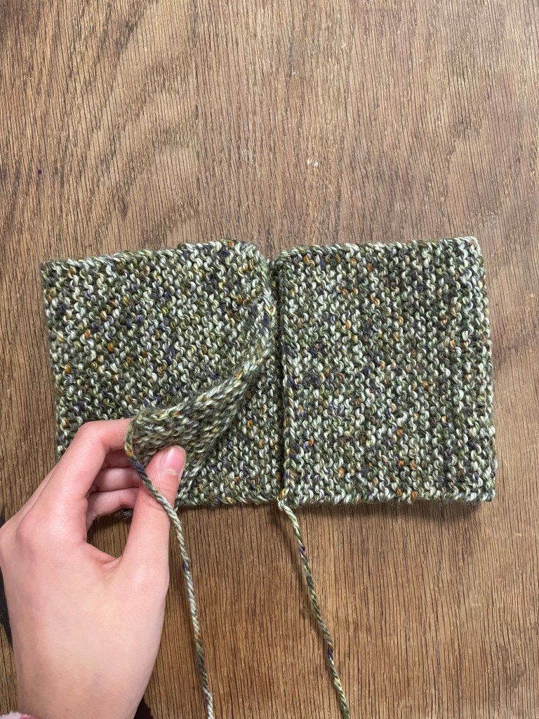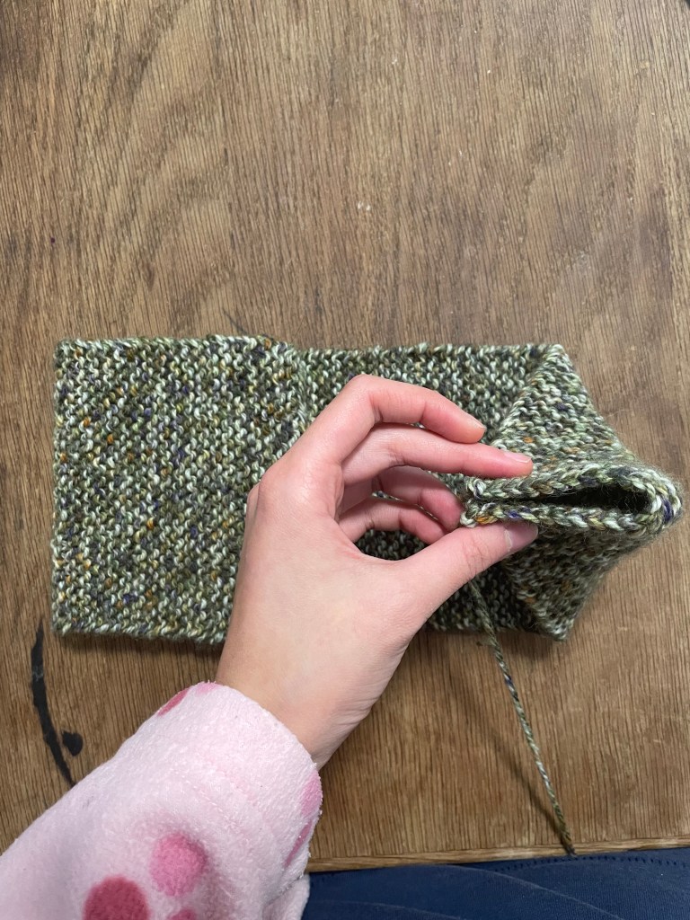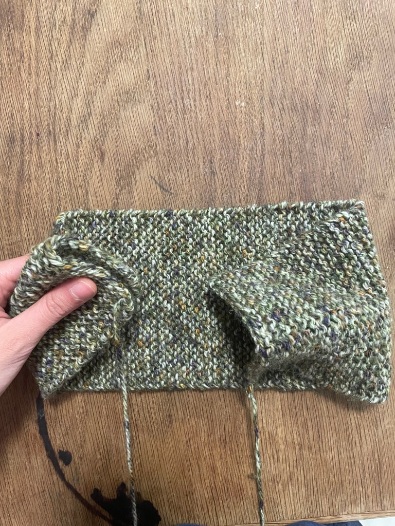 - Knit in garter stitch flat until headband reaches desired length. (Garter stitch means knitting every row, no purl rows!) I knit for a little less than 18 inches. When looking for the right length, I recommend wrapping your knitting around your head to see how it will fit. Make sure to account for stretch — garter stitch stretches A LOT.