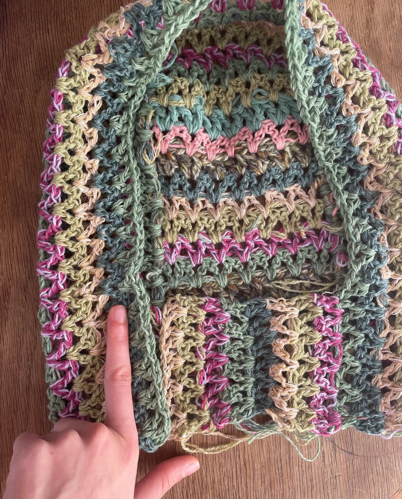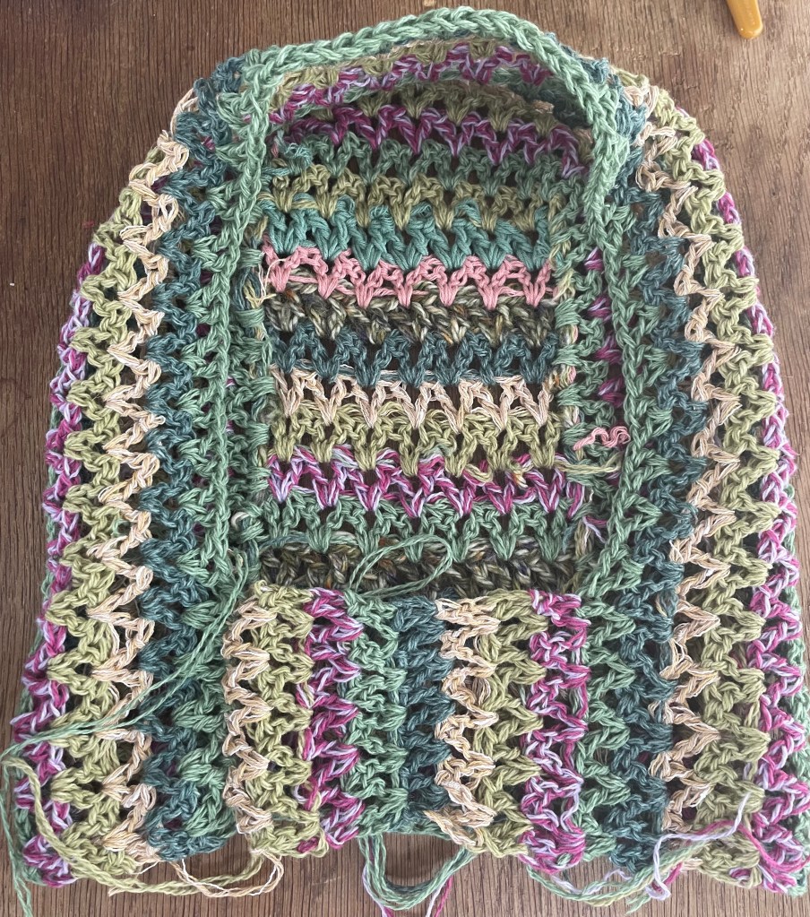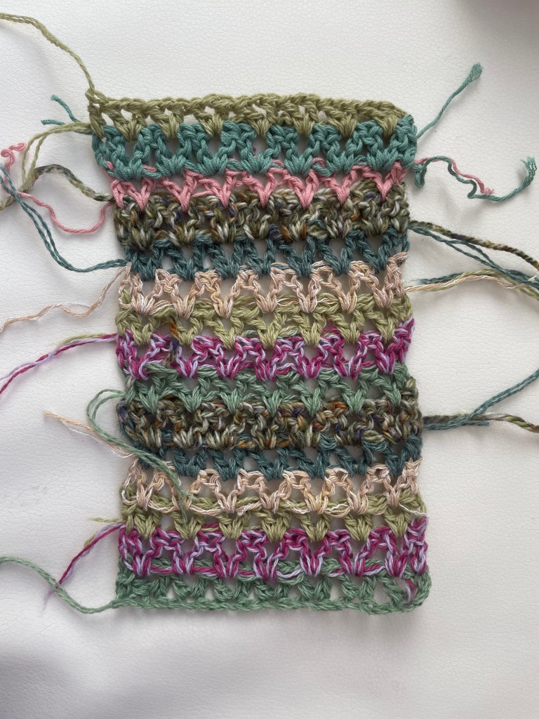 For my version, I used lace weight scrap yarn held double to create a sport weight. I also mixed in some rows of fingering and DK.