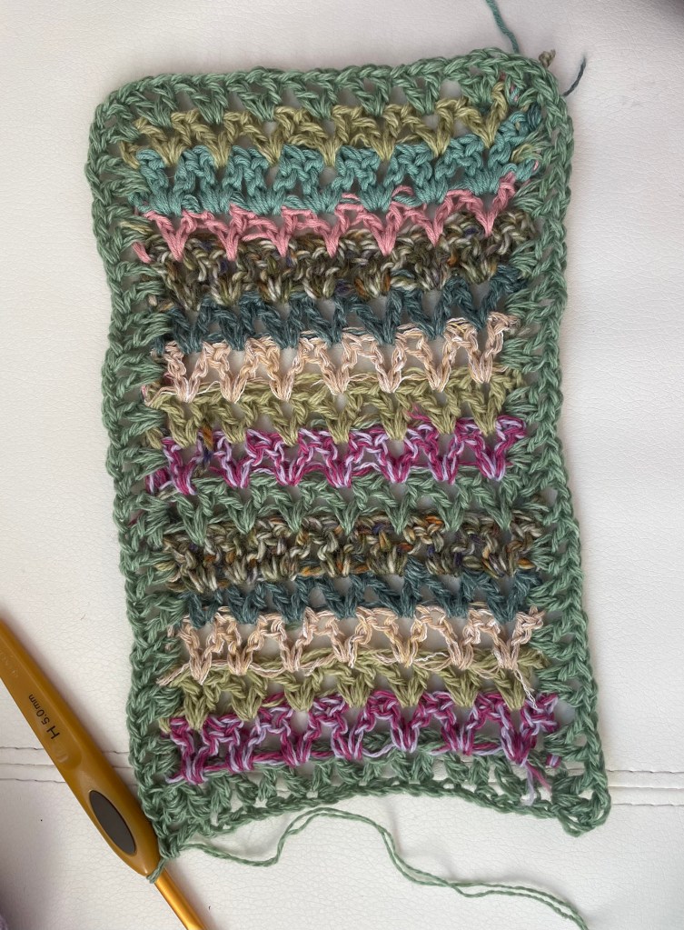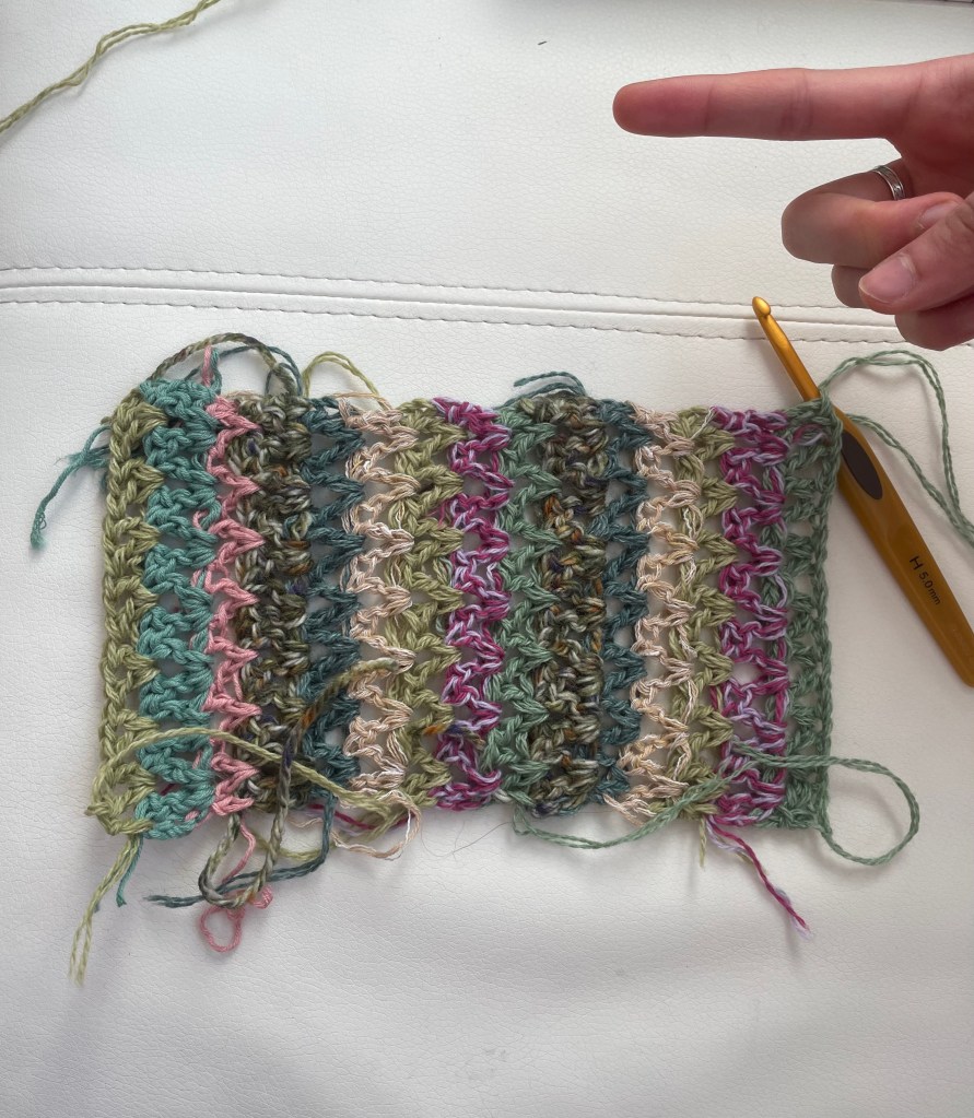 Below I linked a written tutorial on the v-stitch that I found helpful (it includes tips on how to color change!) You can also simply search up this stitch for video tutorials.