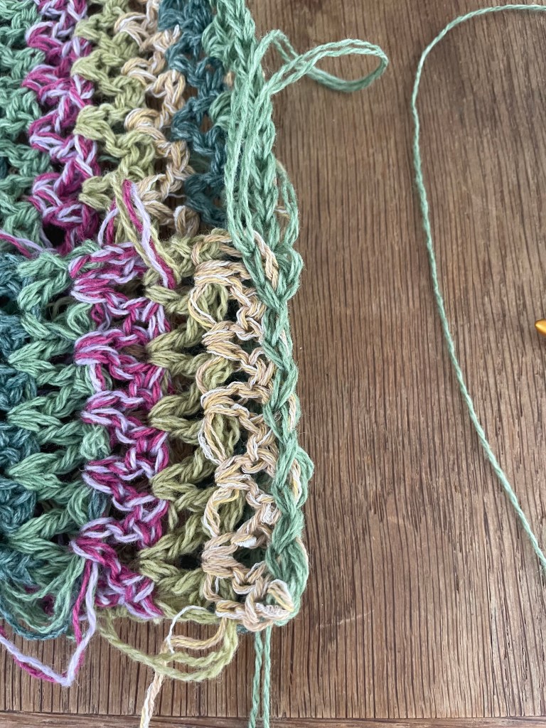 - Now, refasten yarn at the first corner (see photo at bottom).