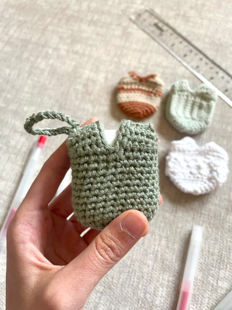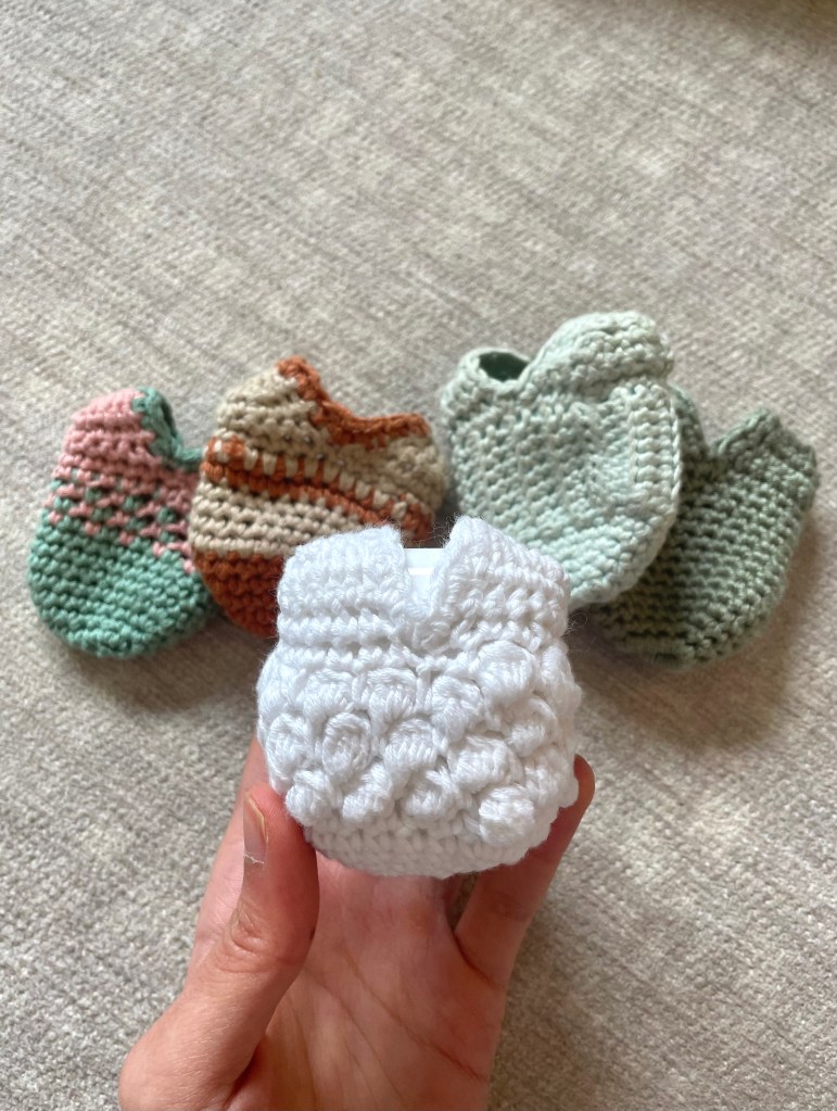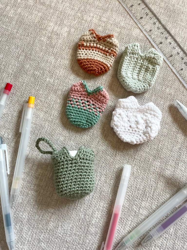 The metallic green one in first is the final iteration of the pattern, and basically the version you’ll get if you follow the pattern directions below. It’s the perfect basic case, made with the simplest of crochet skills. I even added a strap to the top so you can attach your AirPods to a keychain or bag for easy access!